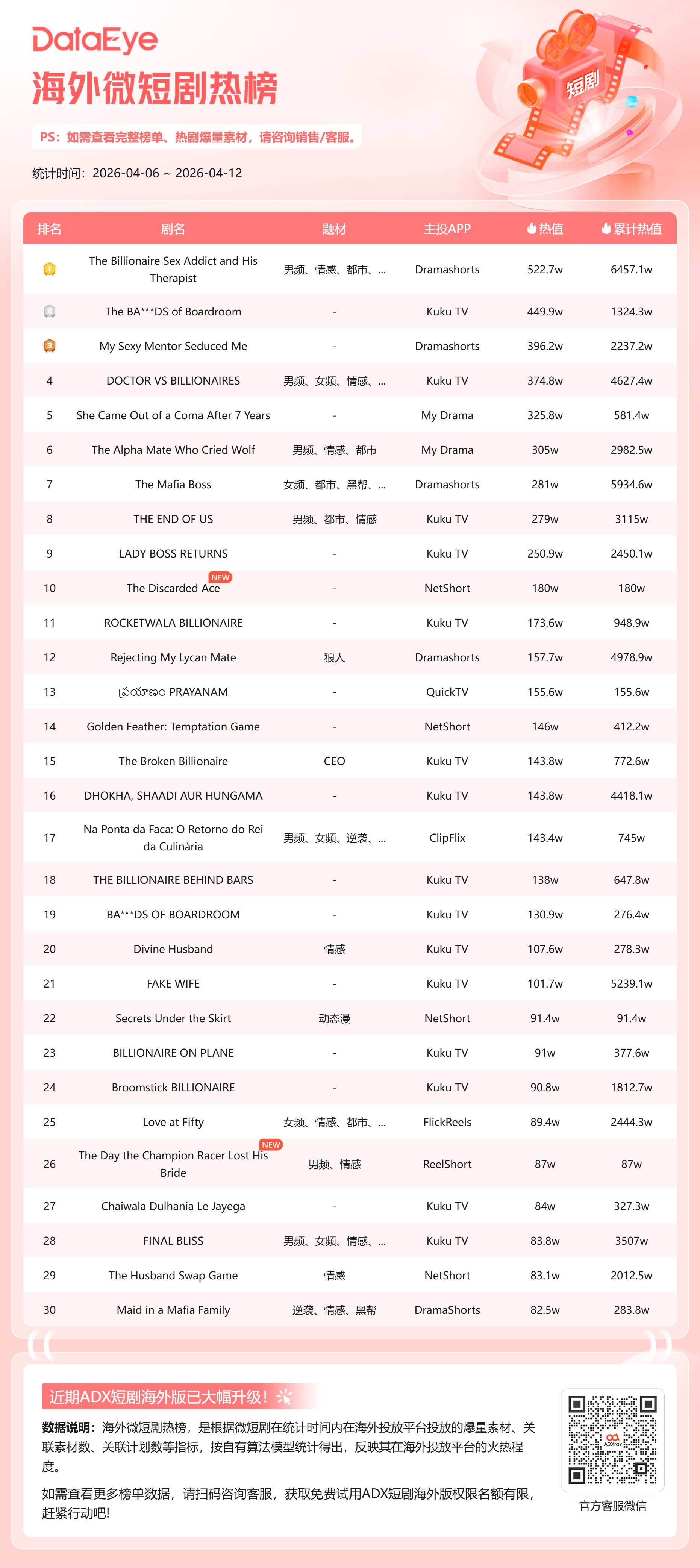 本期(4月6日-4月12日)DataEye海外微短剧热榜,《The Billionaire Sex Addict and His Therapist》蝉联榜首,热值522.7万;《The BA***DS of Boardroom》位列第二,热值449.9万;《My Sexy Mentor Seduced Me》位列第三,热值396.2万。