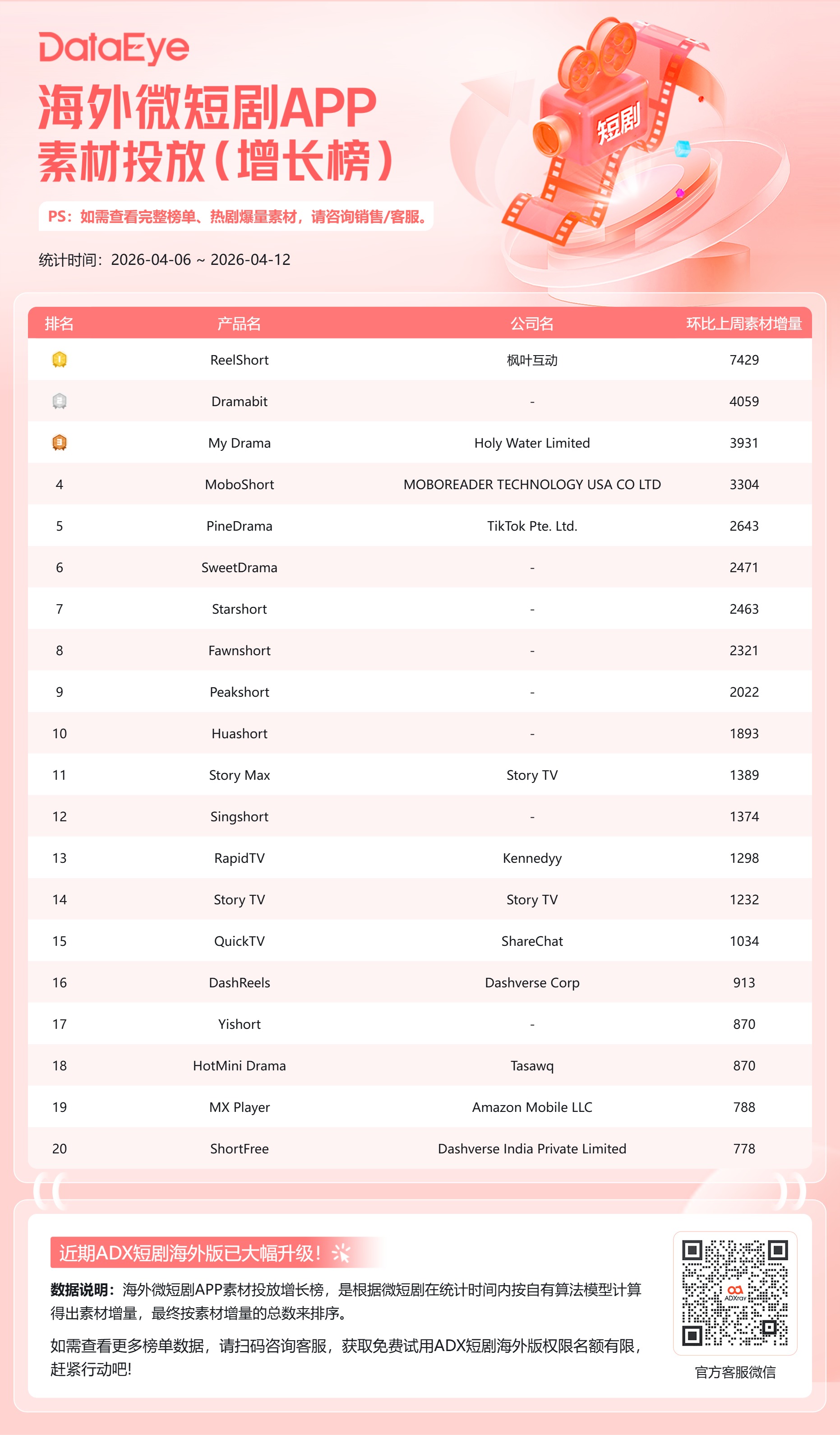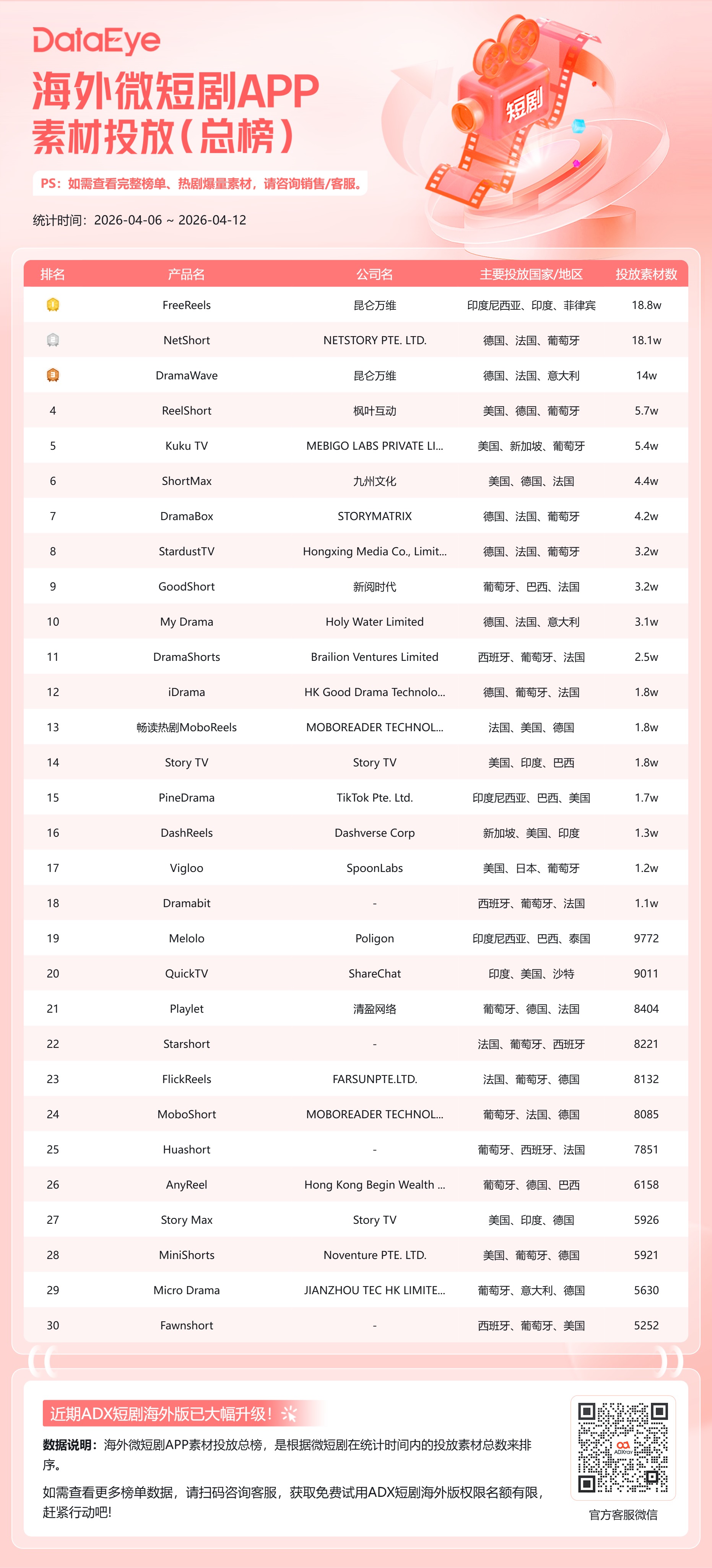 本期(4月6日-4月12日)DataEye海外微短剧APP素材投放榜,FreeReels跻身榜首,素材量18.8万组;NetShort滑落至第二位,素材量18.1万组;DramaWave位列第三,素材量14万组。