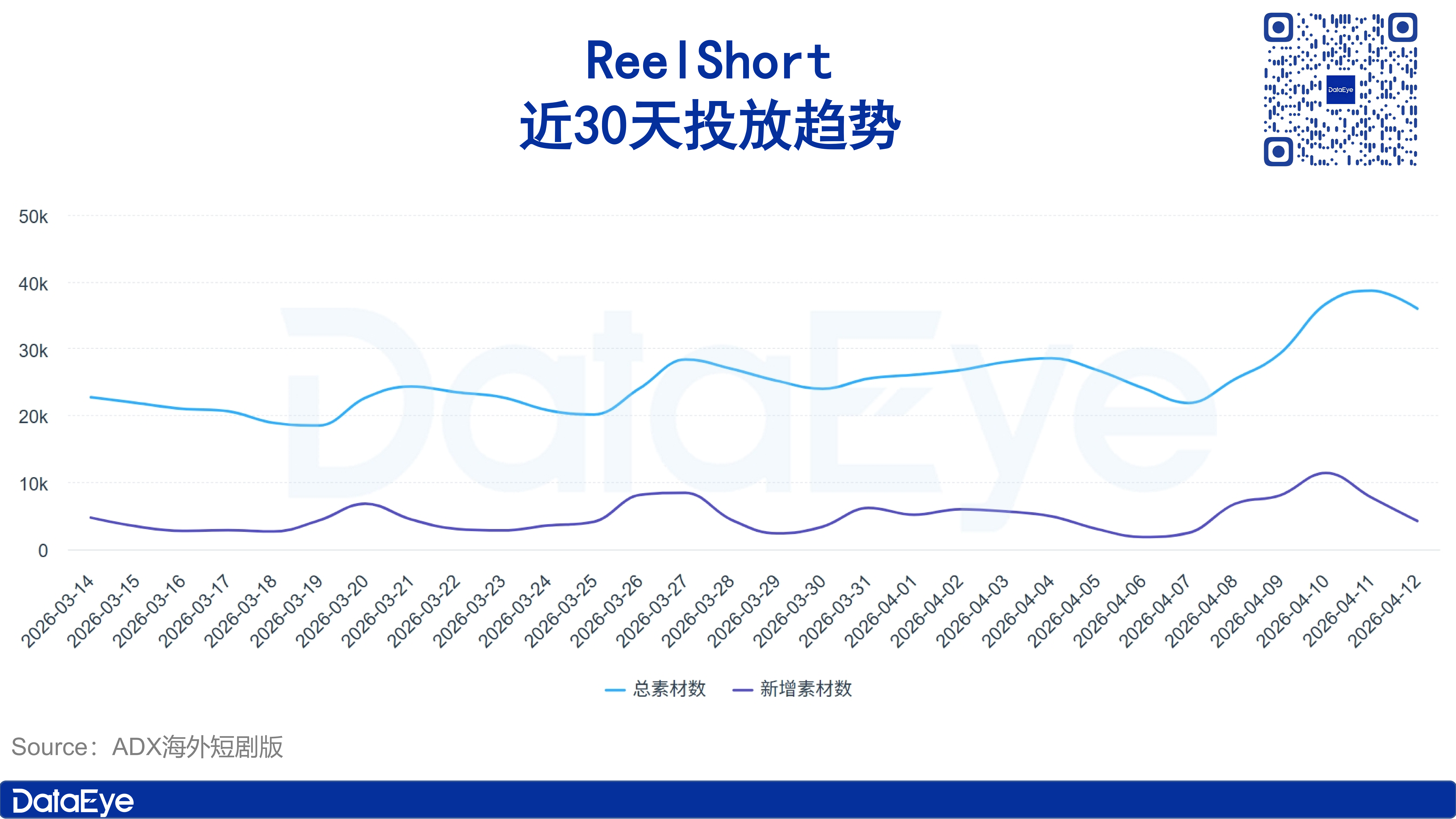 ADX海外短剧版数据显示,近30天,ReelShort投放力度整体呈震荡上行走势,日投放素材量由最初的2万组左右上涨至近期最高4万组左右,4月11日,ReelShort素材量取得近30天最高点38695组。