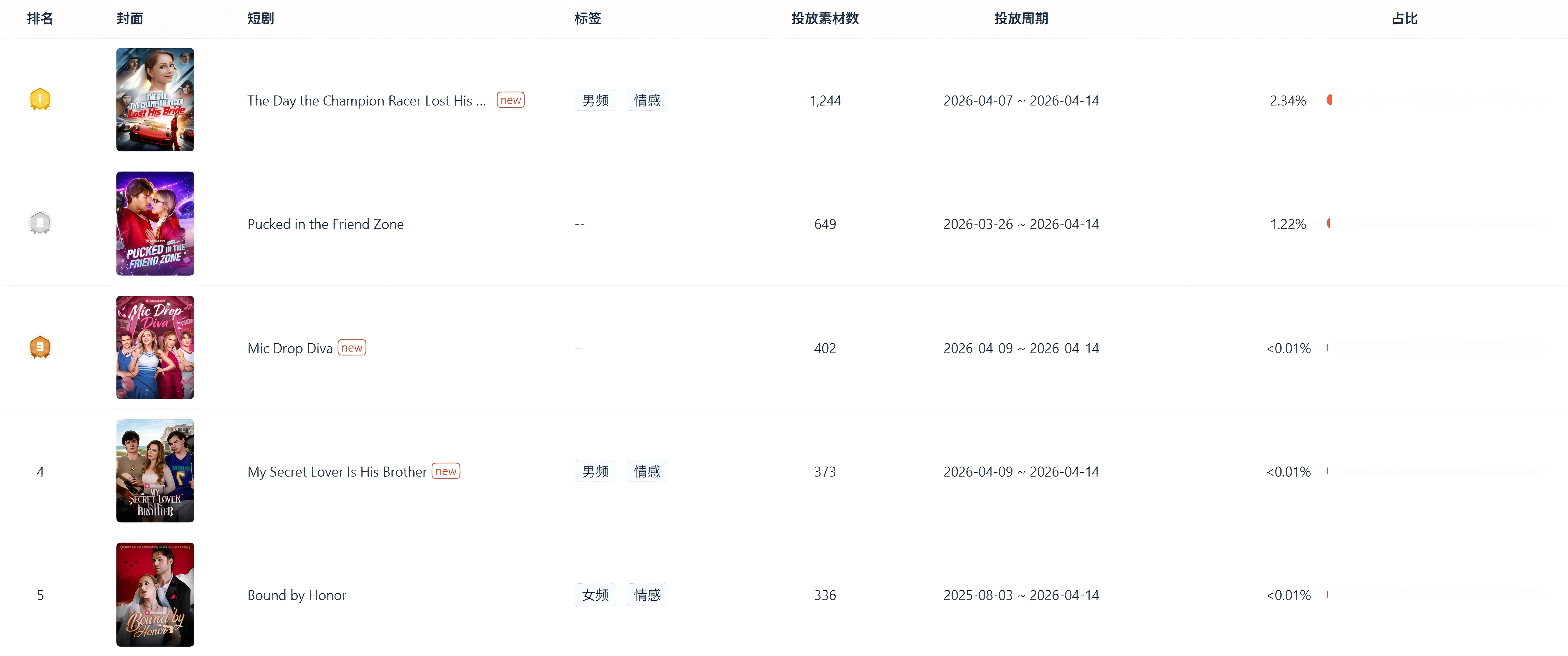 从投放微短剧来看,ReelShort以本土剧为主,近7天,ReelShort共投放1910部微短剧,TOP10均为本土剧。其中《The Day the Champion Racer Lost His Bride》投放素材量最高,占比2.34%,《Pucked in the Friend Zone》紧随其后,素材量占比1.22%。