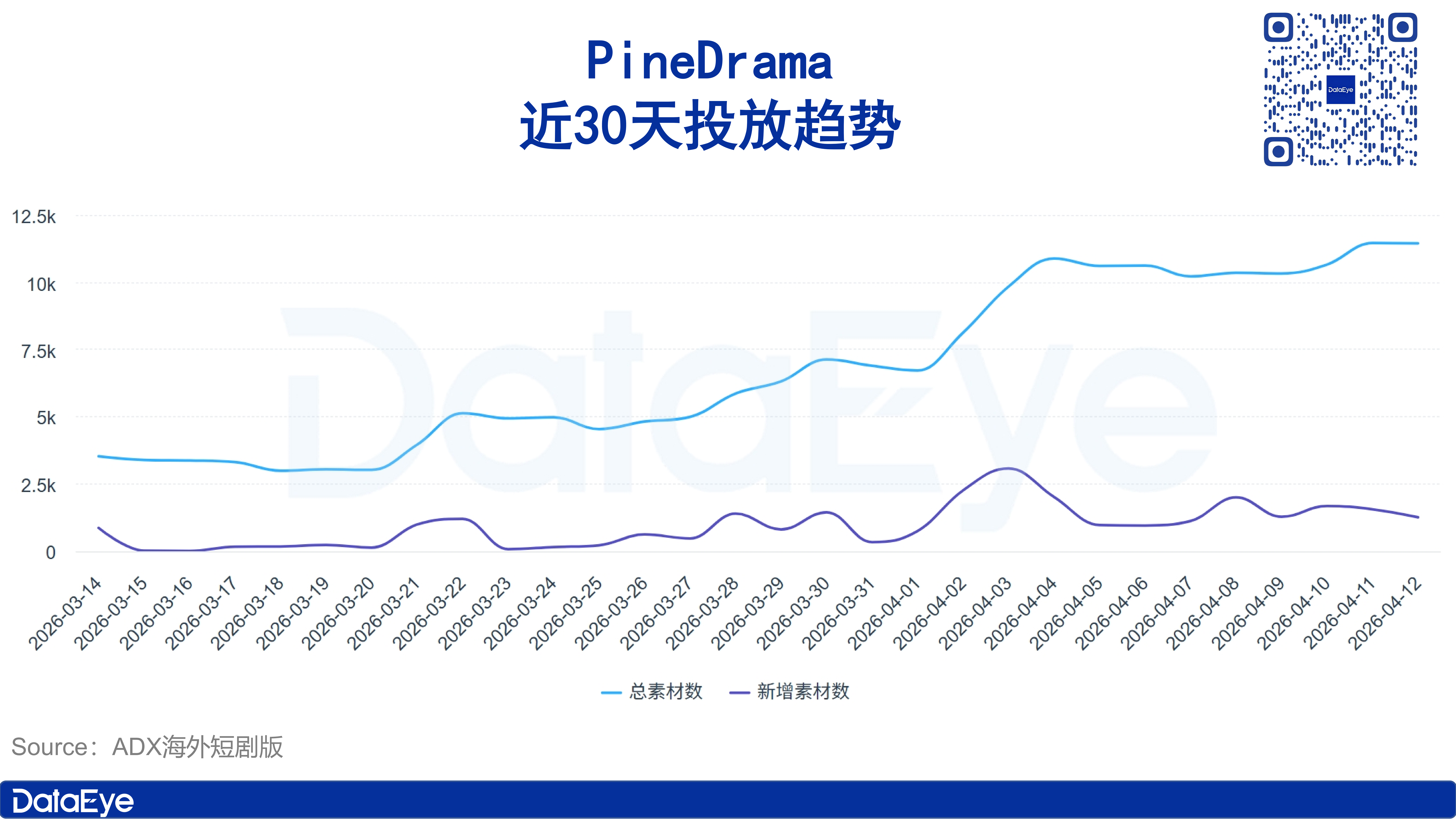 ADX海外短剧版数据显示,近30天,PineDrama投放力度呈上涨走势,日投放素材量由最初的3千组左右上涨至近期的1.1万组左右。4月11日,PineDrama素材量取得近30天最大值11469组。