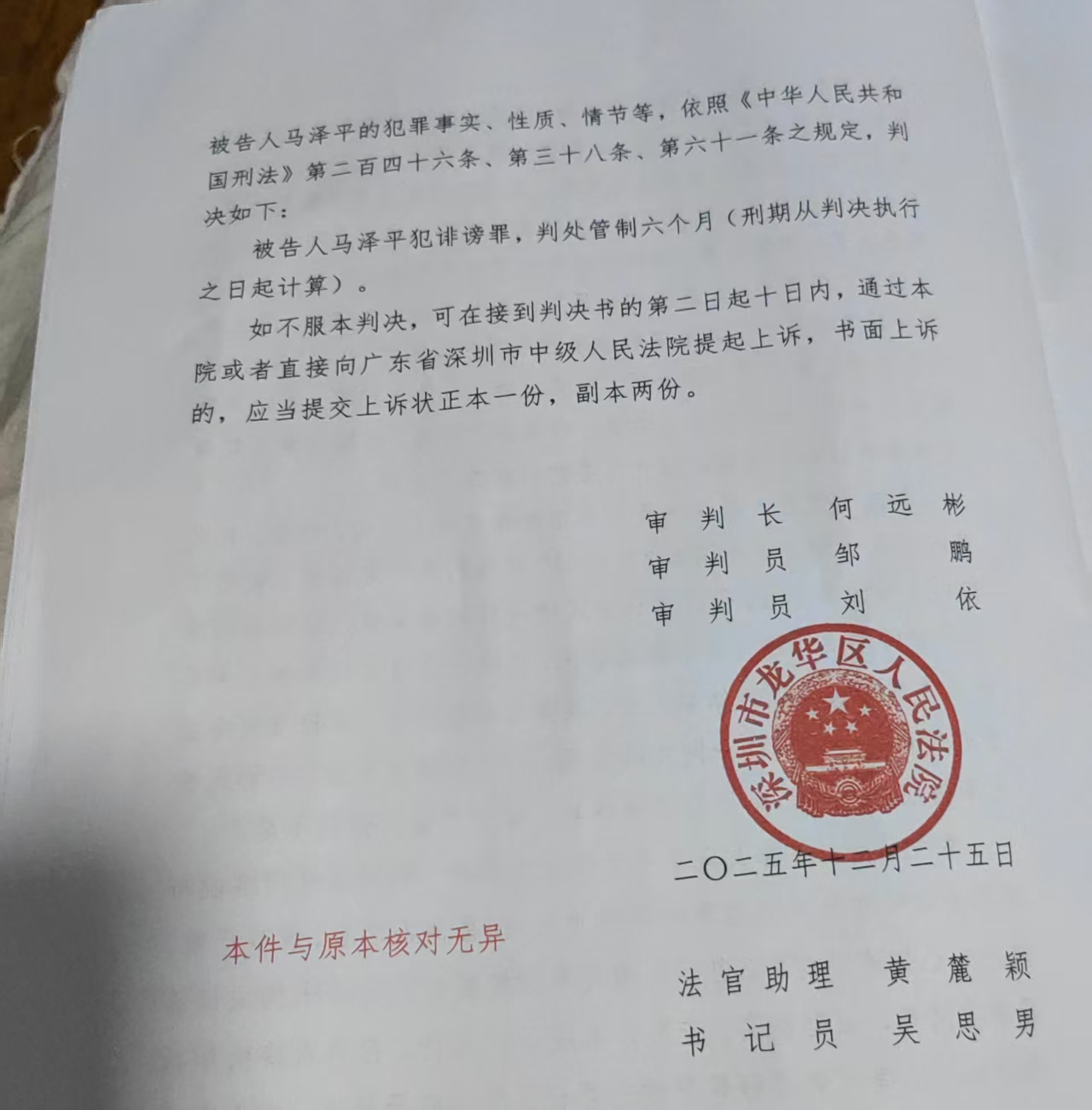 广东省深圳市龙华区人民法院作出的刑事判决书显示,时任中国作家协会会员、中国诗歌学会理事的马泽平,自2024年起在其个人微信公众号(账号名为“泥流”)、抖音账号陆续发布多则文章、视频内容,针对象棋“录音门”事件发表评论,其中大量内容捏造事实诽谤柳大华。