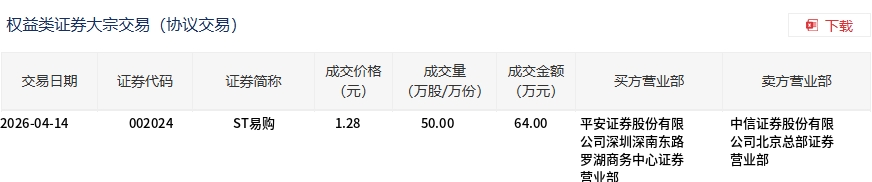 4月14日,ST易购大宗交易成交50万股,成交额64万元,占当日总成交额的1.93%,成交价1.28元,较市场收盘价1.35元折价5.19%。