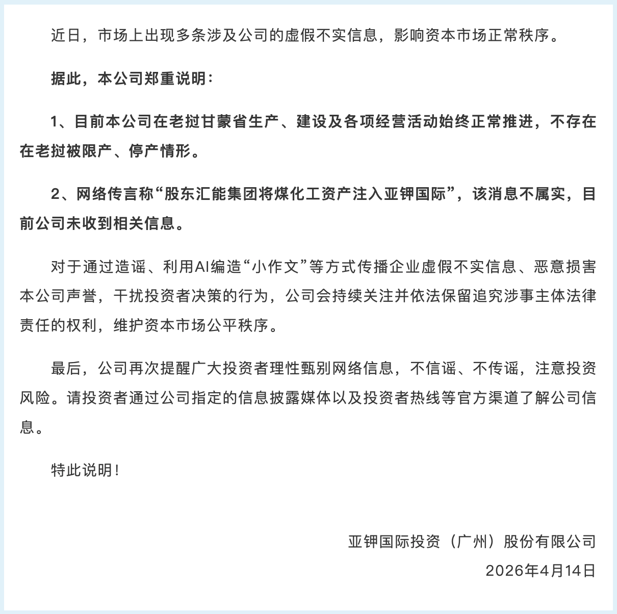 4月14日,亚钾国际发布声明称,目前公司在老挝甘蒙省生产、建设及各项经营活动始终正常推进,不存在在老挝被限产、停产情形。网络传言称“股东汇能集团将煤化工资产注入亚钾国际”,该消息不属实,目前公司未收到相关信息。