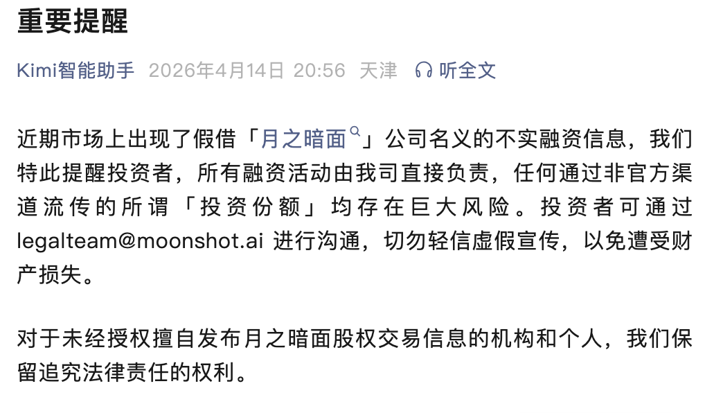 4月14日晚,月之暗面发布提醒称,近期市场上出现了假借“月之暗面”公司名义的不实融资信息,特此提醒投资者,所有融资活动由公司直接负责,任何通过非官方渠道流传的所谓“投资份额”均存在巨大风险。对于未经授权擅自发布月之暗面股权交易信息的机构和个人,公司保留追究法律责任的权利。