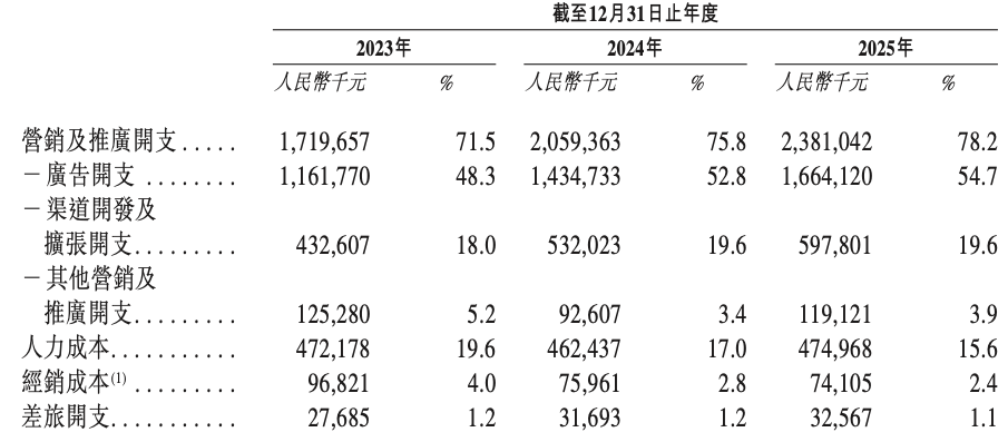 仅广告开支一项,就从2023年的11.62亿元增至2025年的16.64亿元,两年增长超过43%。这些钱流向了明星代言、KOL合作、社交媒体内容营销等。2023年-2025年,自然堂分别拥有52名、66名及98名内部KOL,及分别与约1.19万名、1.06万名及1.36万名外部KOL合作。