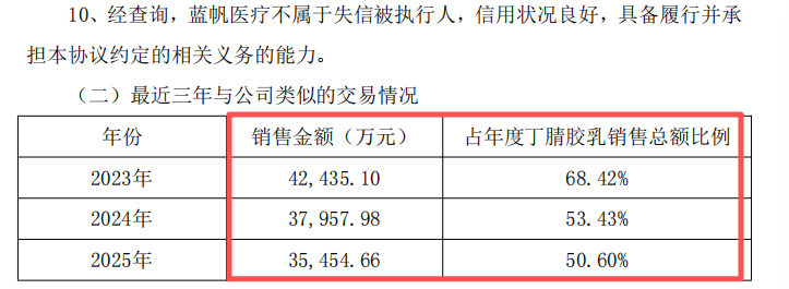 从公告提供的数据上看,双方的合作早已深入。最近三年,齐翔腾达对蓝帆医疗的销售金额分别为:2023年4.24亿元(占丁腈胶乳销售总额68.42%)、2024年3.80亿元(53.43%)、2025年3.55亿元(50.60%)。蓝帆医疗的采购数据也印证了这一关系:同期采购金额占丁腈胶乳采购总额的比例分别为51.94%、32.84%、41.18%。