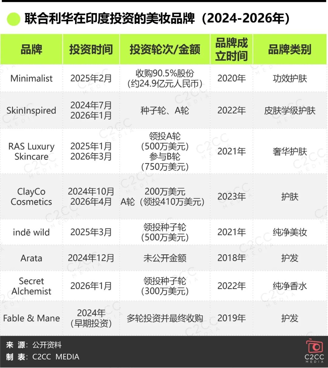 两年内完成8次对印度美妆品牌的投资,覆盖从成立不足一年的初创品牌到已具规模的功效护肤品牌,以最广覆盖面、最快投资节奏,精准捕捉印度美妆市场爆发前夕的各类潜在增长机遇。