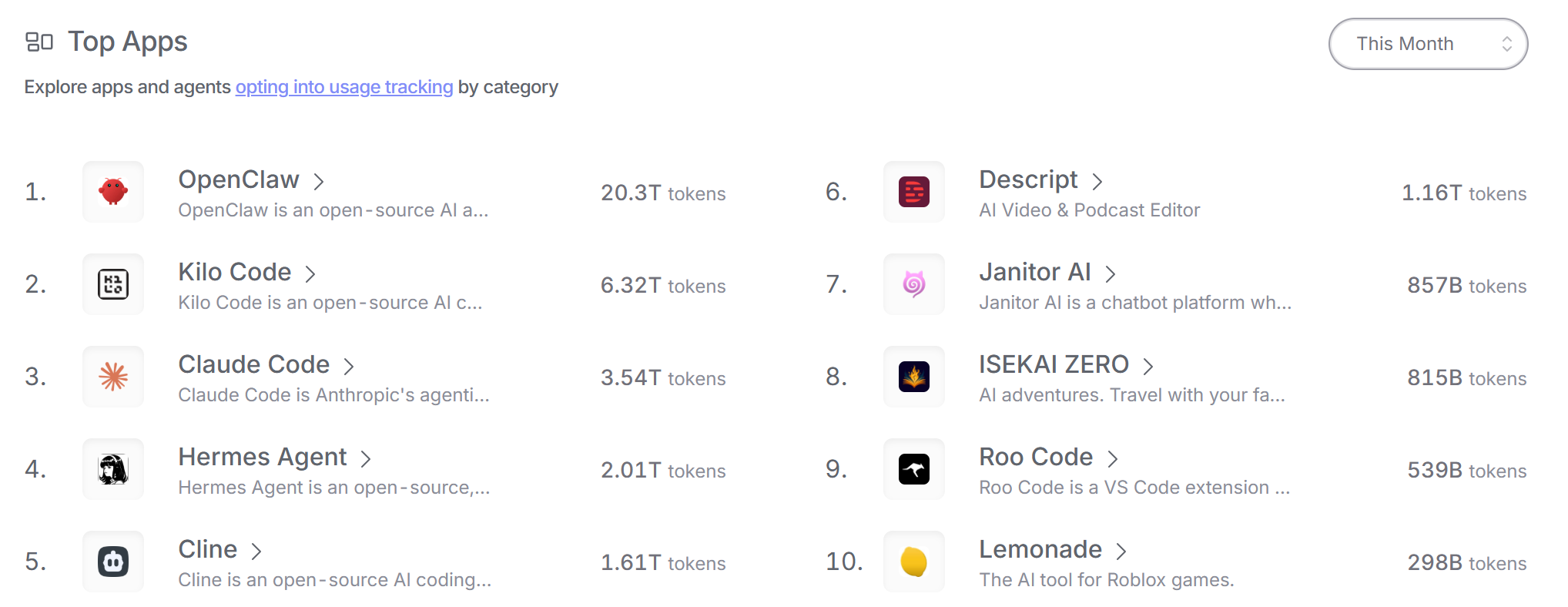 OpenRouter平台的实时数据,一定程度上能看出这场热潮的大致流向。从本月应用消耗榜来看,上榜的几乎都是编程与Agent工具,其中OpenClaw以20.3T tokens断层领跑。