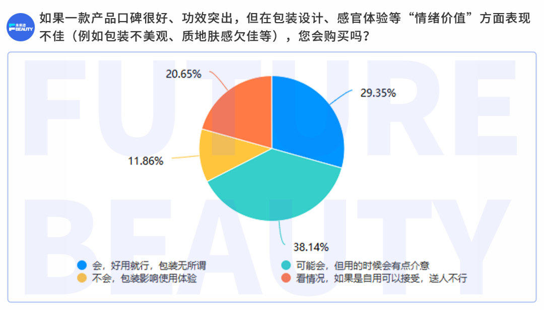 这种变化,在具体的消费决策中被反复验证。当一款产品功效足够好,但包装不吸引人、质地肤感一般时,超过六成的人表示“会买”或“可能会买”。在他们看来,好用就是硬道理。