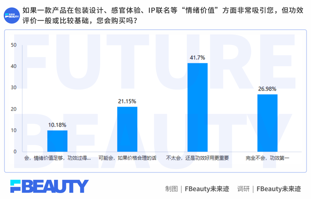 而当场景反转,一款产品包装精美、IP联名吸引人,但功效评价一般时,愿意为此买单的比例明显下降。功效是入场券。但入场之后,谁能让消费者多停留一会、多看一眼,情绪价值就开始发挥作用了。这与几年前“颜值即正义”的消费逻辑形成了鲜明对比,功效不再是可选项,而是必选项。