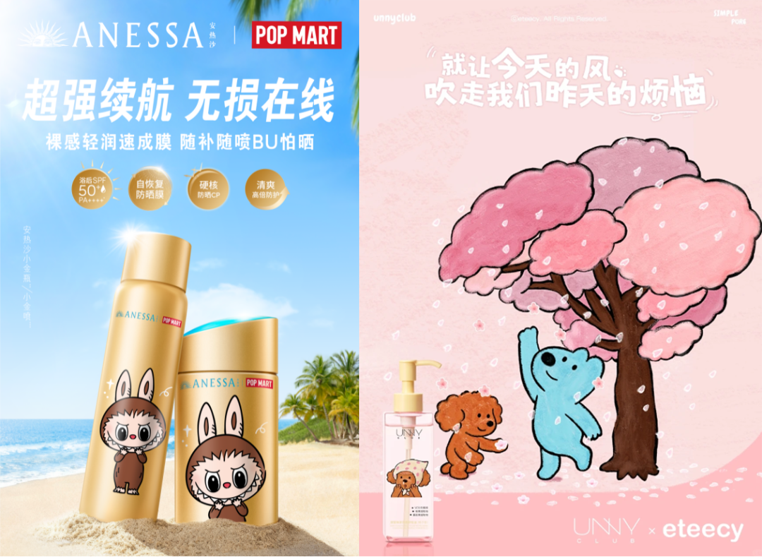 安热沙与THE MONSTERS的联名,两者的契合不止于表面形象,更在于价值观的深度交融——安热沙的“硬核专业守护”与LABUBU的“趣味冒险精神”共同指向“户外探索”这一场景,专业为冒险保驾护航,趣味为专业注入灵魂。UNNY与治愈小狗eteecy的联名,以温暖、可爱的IP形象唤起用户的治愈感和陪伴感,周边产品成为粉丝争相收藏的“精神慰藉品”。