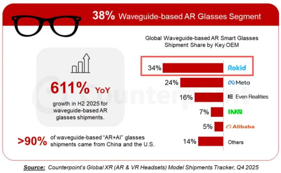 据余杭市政府援引全球技术市场研究咨询机构Omdia数据显示,Rokid在AI眼镜全品类中位居全球第二、中国第一,带显示功能细分赛道更是位居全球榜首。另据Counterpoint Research报告,2025年下半年,Rokid在光波导信息提示类AR眼镜细分市场以34%的份额位居全球第一,领先于Meta(24%)和Even Realities(16%)。