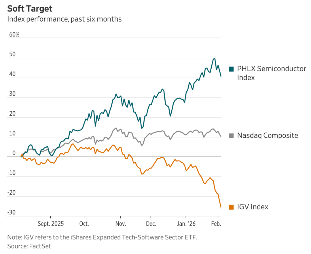 最近几个月软件公司股价深陷泥潭,在AI明星产品(比如Anthropic旗下Claude)的冲击下,IGV今年已下跌接近25%。目前软件行业的市销率已经从9倍骤降至6倍——这是过去十年全球从未见过的水平。