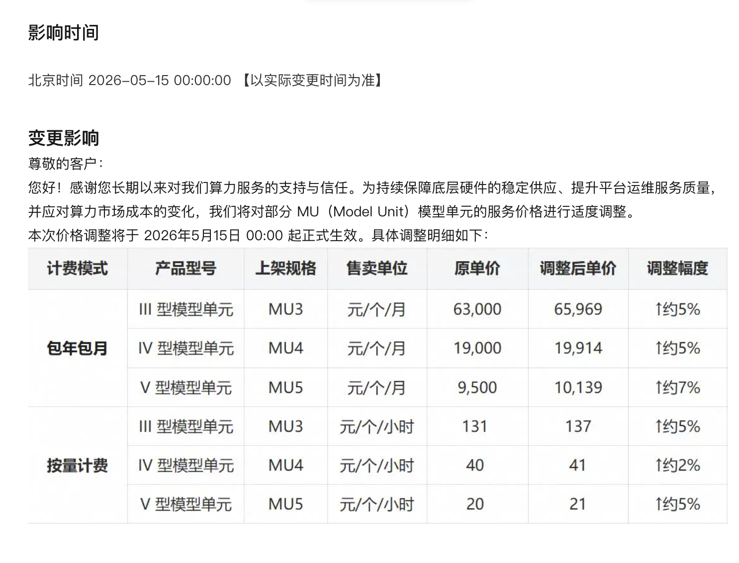 4月15日,阿里云公告称,为持续保障底层硬件的稳定供应、提升平台运维服务质量,并应对算力市场成本的变化,我们将对部分MU(Model Unit)模型单元的服务价格进行适度调整。本次价格调整将于2026年5月15日00:00起正式生效。