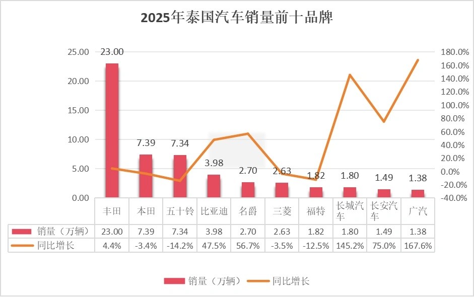 从数据来看,日系车衰落、中国汽车崛起的变化趋势在一些国家已经出现。以东南亚为例,一直以来,东南亚都被视作日本汽车的“后花园”,比如泰国,以前九成以上的市场被日系车占据。而根据2025年的销量情况,日系车的市场占有率跌破70%关口,降至68.4%,较此前大幅缩水,相反,比亚迪、名爵、长城等我国汽车品牌的增长势头惊人。