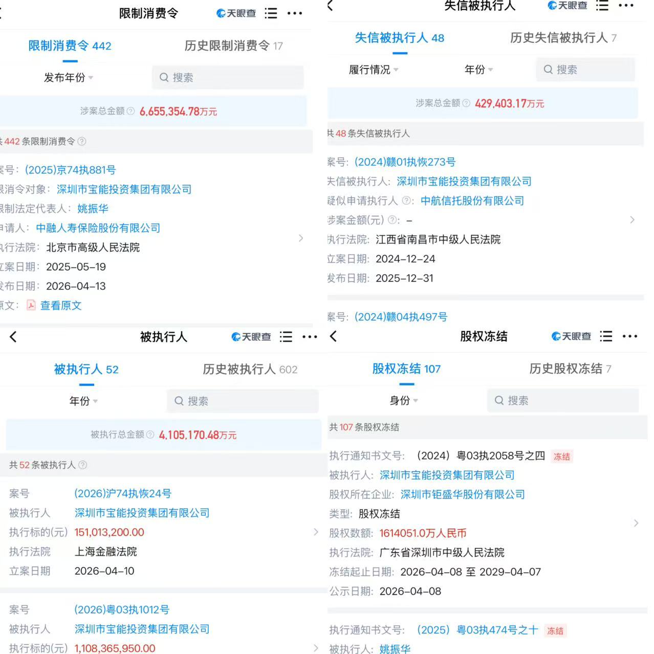 另据界面新闻统计,截至4月15日,宝能集团现存52条被执行人信息,被执行总金额超410亿元。最近的一次是4月10日,宝能集团被执行超过1.5亿元,执行法院为上海金融法院。此外,该公司还有失信被执行人(老赖)信息48条,涉案总金额超过42.9亿元;有349件终本案件,执行标的总金额约316亿元,未履行总金额约256亿元,未履行比例高达81.1%;公司目前还有442则限制消费令,涉案总金额超过665亿元。