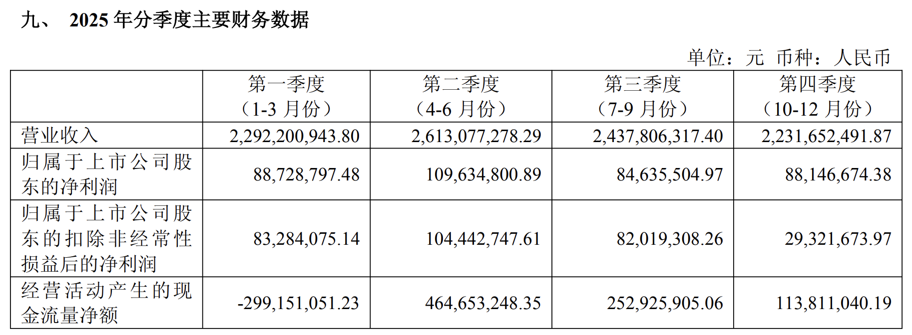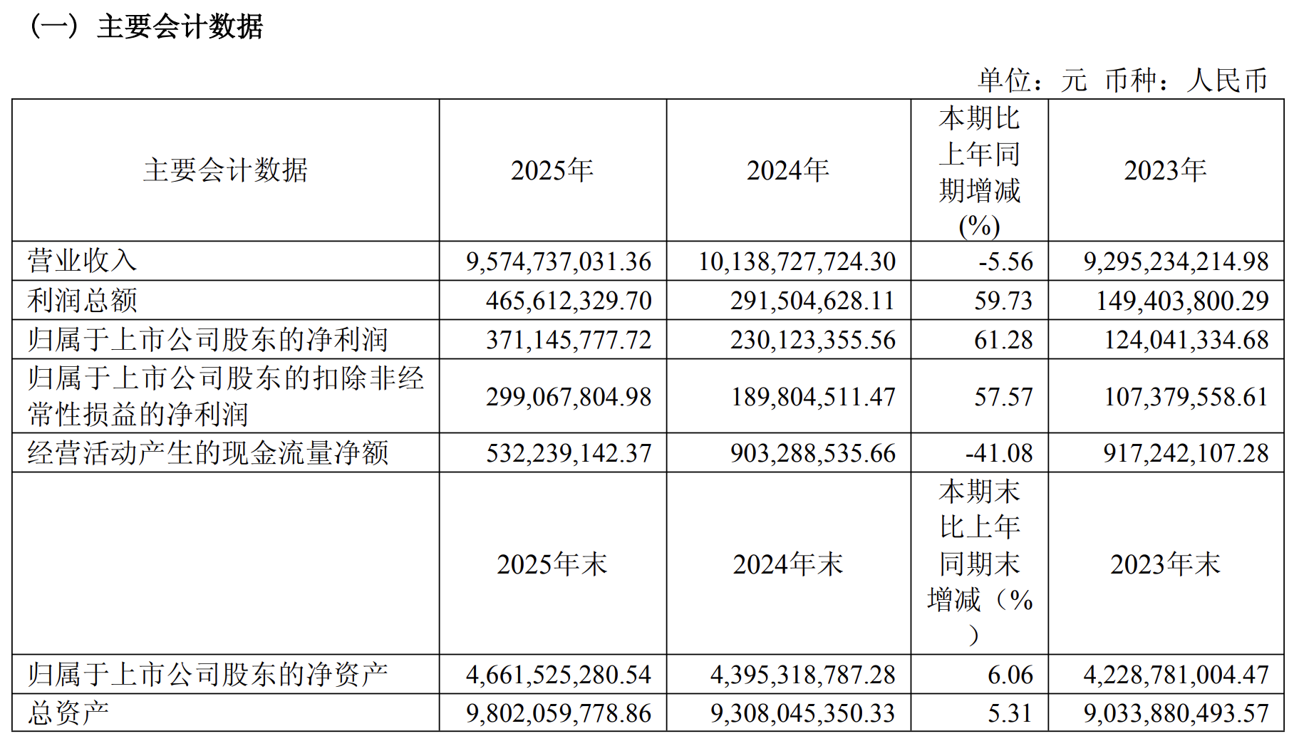 年报显示,公司2025年实现营业收入95.75亿元,同比下滑5.56%;归母净利润达3.71亿元,同比增长61.28%。