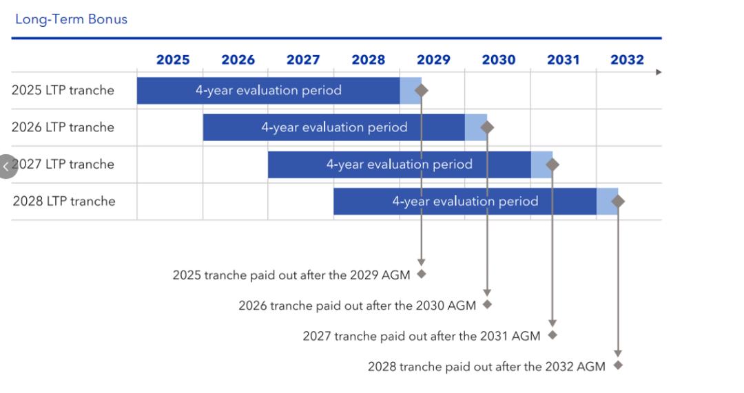 具体而言,拜尔斯道夫在常规LTP之外,专门增设了“LTP 2025—2029”额外档位,目标总薪酬按比例分摊至整个2025—2029年评估周期。这一结构意味着CEO的薪酬兑现周期最长可达5年。