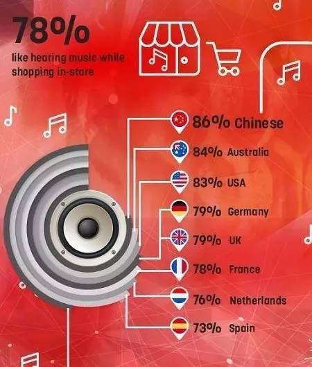 其次,80%的消费者认为音乐能让他们拥有更愉快的购物体验,三分之二的受访者表示,如果喜欢某品牌店内播放的某首曲子,他们往往能更融入到该品牌。