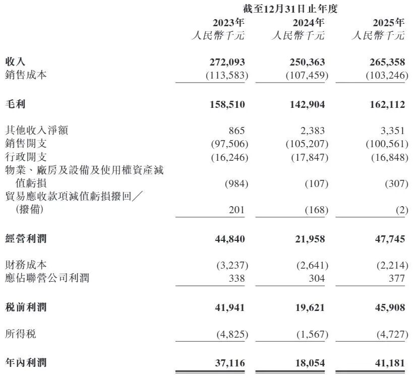 在自有品牌和第三方品牌的共同发力下,毛源昌眼镜2023年—2025年分别实现收入2.72亿元、2.5亿元和2.65亿元,分别实现年内利润3711.6万元、1805.4万元和4118.1万元。