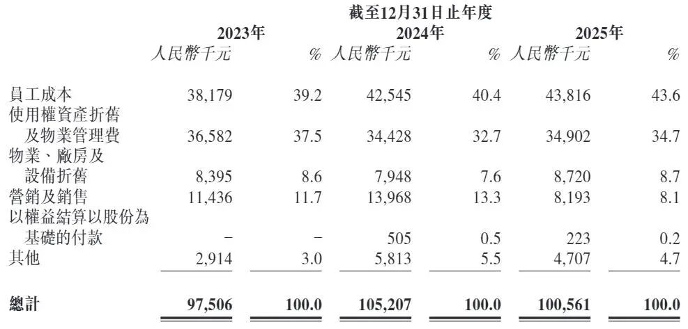 毛源昌眼镜的销售开支包括员工成本、使用权资产折旧及物业管理费(租金成本)、营销及销售开支等。