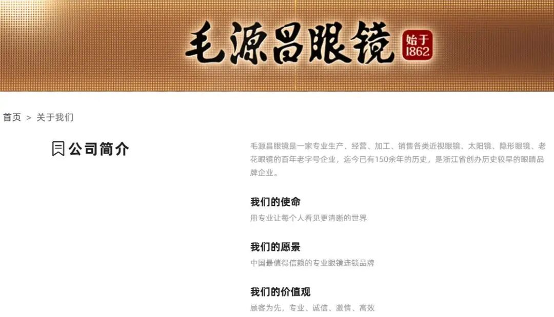 而时间回拨,在中国的另一端,1862年(清同治元年),绍兴人毛四发在杭州太平坊一带(今中山中路)挂出了“毛源昌号”的招牌。1956年,“毛源昌号”公私合营,与其他三家眼镜店合并成立了毛源昌眼镜厂。2006年,毛源昌被商务部认定为“中华老字号”企业。截至目前,“毛源昌”已拥有164年的品牌历史。