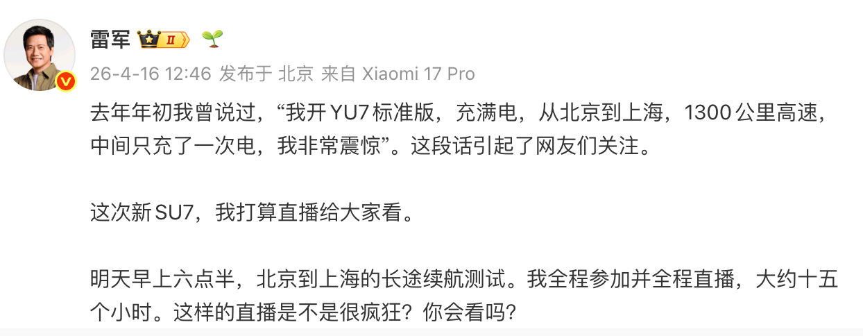 小米创办人、董事长兼CEO雷军4月16日发文表示,打算直播新SU7给大家看,“明天早上六点半,北京到上海的长途续航测试。我全程参加并全程直播,大约十五个小时。”