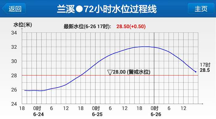 受梅雨强降雨影响,钱塘江发生流域性大洪水,兰江出现1955年以来第二大洪水。25日7时兰溪站开始超保证水位(31.00米),20时15分兰溪站最高水位32.04米,洪峰流量14500立方米/秒,超过2011年“6•20”特大洪水。26日16时,兰溪站水位已回落至28.74米。