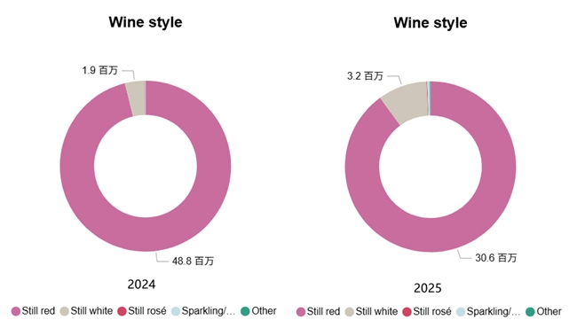 2024 年出口中国大陆白葡萄酒190 万升,占总出口3.69%;2025年白葡萄酒出口量攀升至320 万升,占比大幅提升至9.27%。