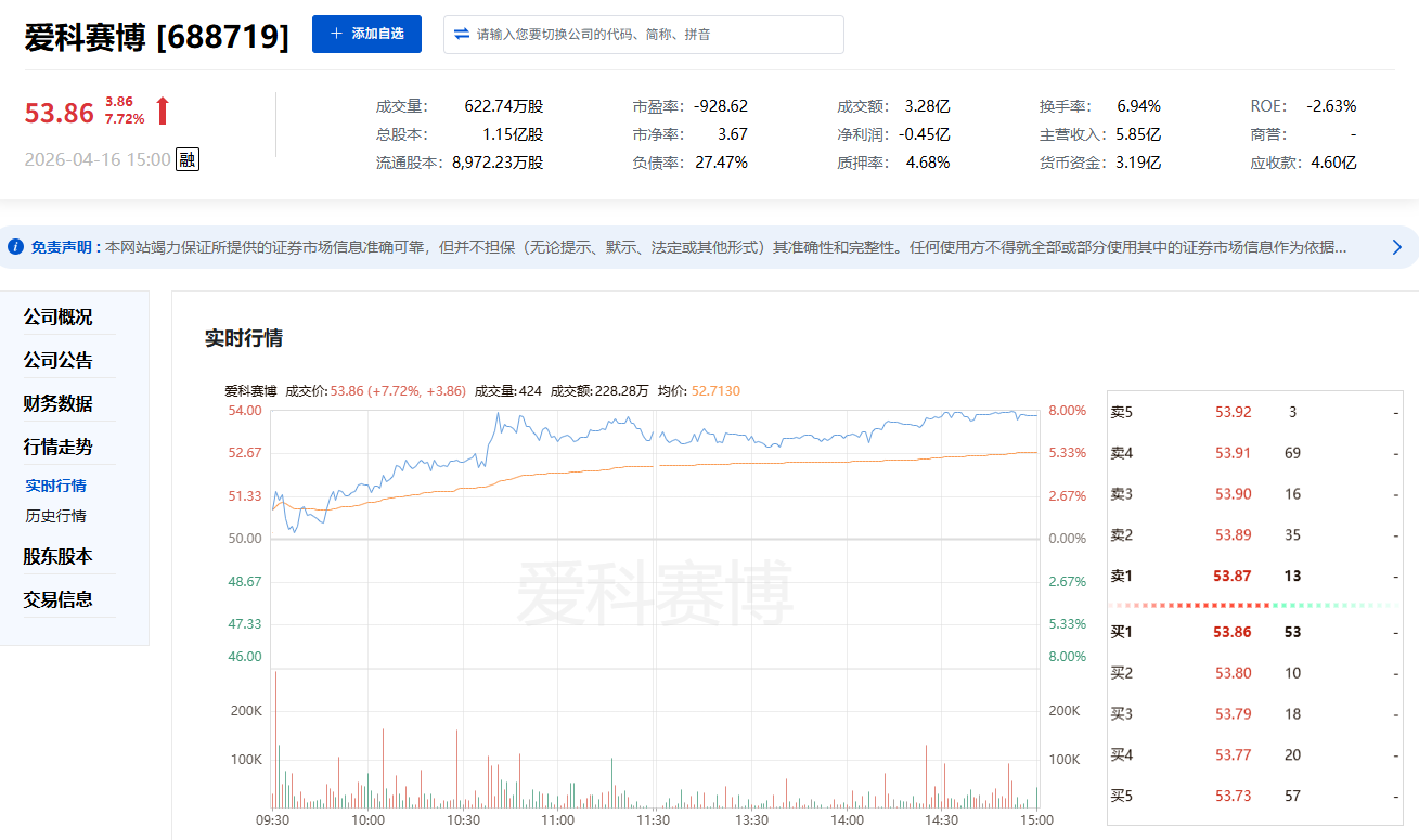 爱科赛博(688719):陕西板块涨幅第一
