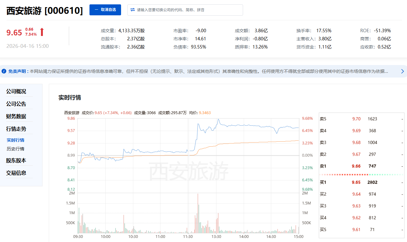 西安旅游(000610):文旅消费龙头领涨