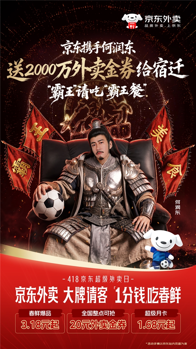 “霸王”送给宿迁的“霸王餐”再加码!4月16日,京东携手“西楚霸王”角色扮演者、著名演员何润东向江苏宿迁市民送出2000万外卖金券。4月16日至4月18日,宿迁用户上京东APP点击秒送频道或在京东外卖APP搜索“宿迁金券”,在每天8点至23点整点可抢宿迁专享20元外卖金券。