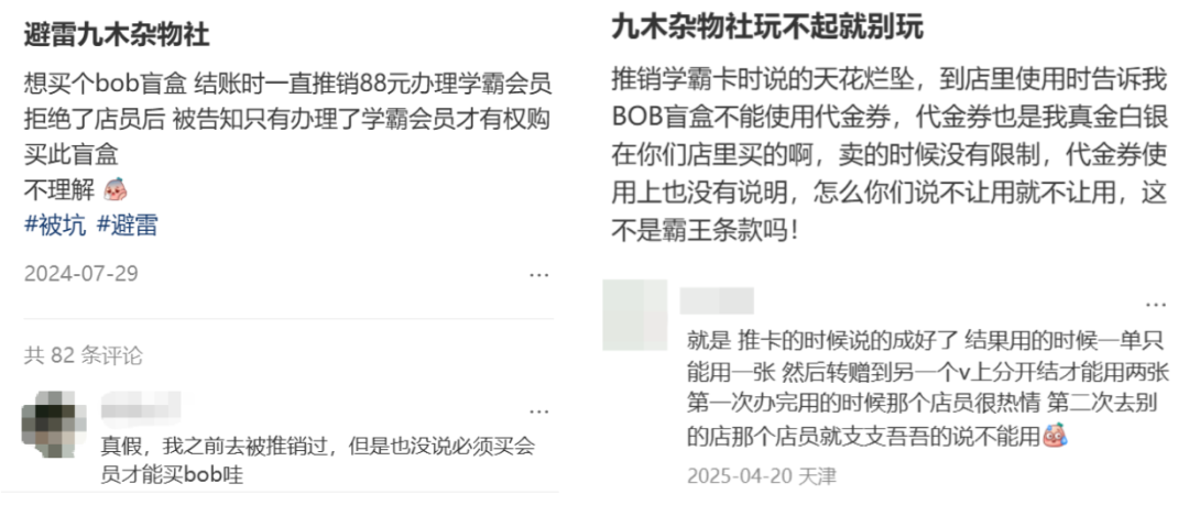 在网上搜索“九木杂物社”,关于会员卡的讨论仍然居高不下。这些帖子大多集中在24-25年,也曾经是杂物社门店最具争议的地方。除了南方都市报,在小红书、黑猫等平台上也有大量相关抱怨。