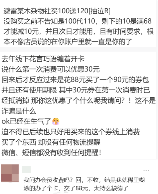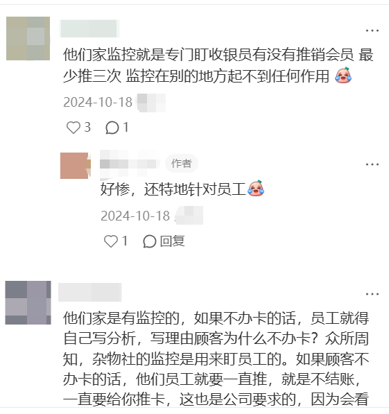 不少从杂物社离职的店员表示,当时的杂物社门店有严苛的开卡KPI和话术考试。小芹对杂物社的“心理阴影”,也是无数人消费体验的缩影:有些店员会采用模棱两可的诱导话术,如不告知优惠的生效条件、声称部分商品只有会员才能购买等。