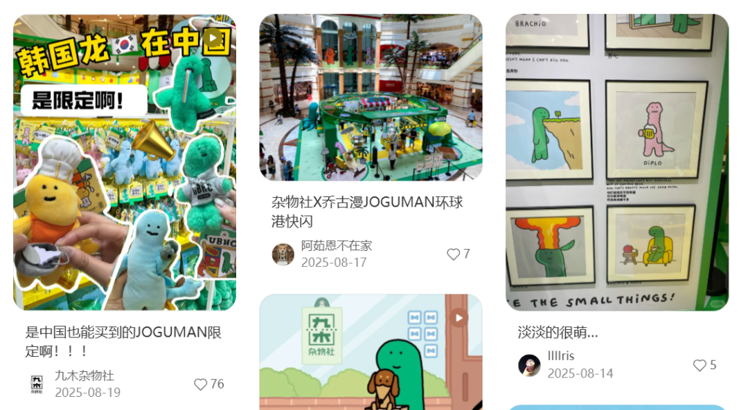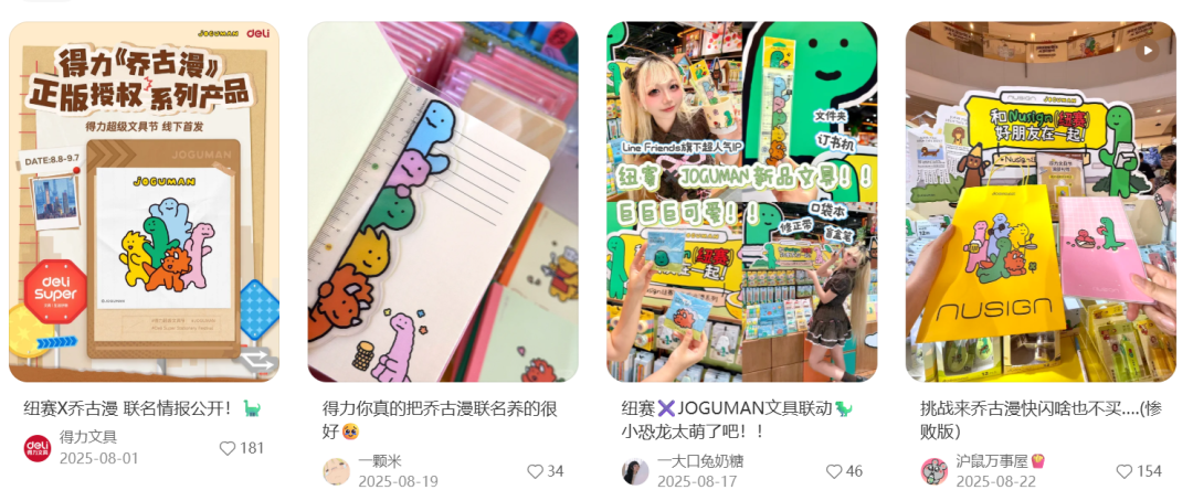 去年的“乔古漫”就是一个缩影:2025年4月,九木杂物社抢下绿色小恐龙乔古漫JOGUMAN的IP联名,这个韩国IP此前联名的品牌是CASETiFY、泽田本家等,在内地的产品还相对稀缺。杂物社趁机定出了较高的溢价:15元的拍纸本,49.9元的挂绳,139.9元的抱枕,并策划在8月开出快闪。然而,得力也在8月官宣了旗下文具副牌纽赛与乔古漫联名,主打10-20元的日常平价文具,同步上线快闪店。虽然客单价稍微错开,但双方快闪档期完全“撞车”,在营销传播上无疑成了一场硬碰硬的暗战。
