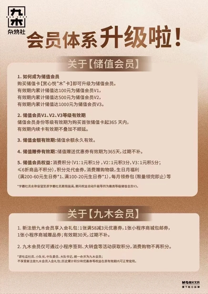 但她担心的尴尬没有发生。四月的第一个周末,全国的杂物社里不再有店员提起开卡的事:4月1日,九木杂物社宣布全面调整会员体系。原有的88元年卡,即“学霸社员权益”被取消,改为免费会员和储值积分会员。