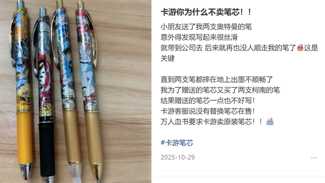 晨光卖的IP联名笔,卡游也能卖,且IP运作更快、转化更强,质量口碑也不输专业文具厂商,甚至有人专门去找卡游的冷门IP笔囤货。这说明如今制造本身的门槛没有那么高了,真正值钱的是IP组织能力、内容运营能力和消费转化能力。