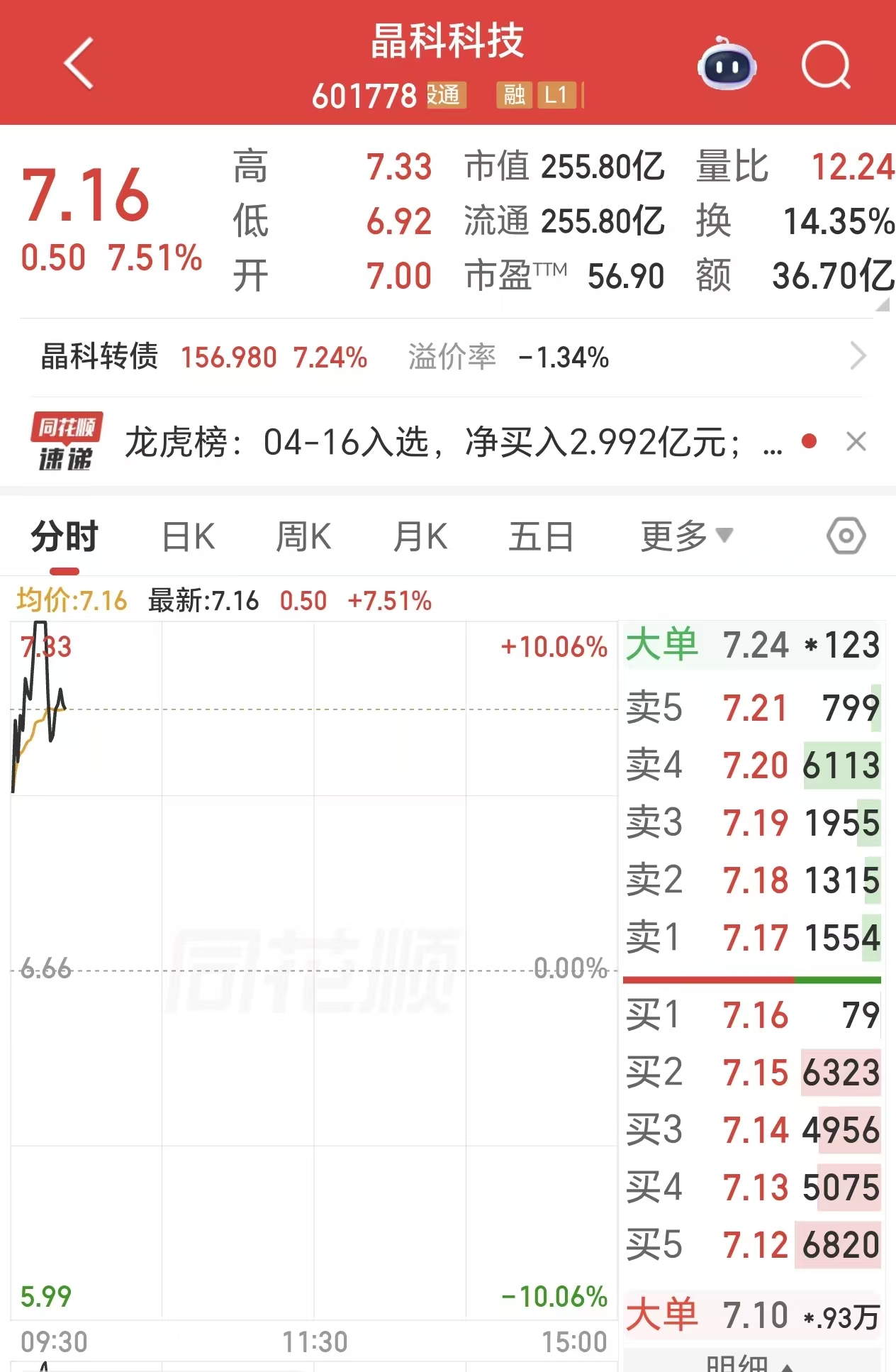 然而,二级市场对于晶科科技此次投资显现出了一定程度的追捧。4月17日开盘,晶科科技一度涨停。截至界面新闻记者发稿前,其股价涨幅为7.51%,报7.16元/股,市值为255.80亿元。