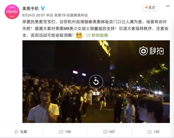 25号凌晨2点,美图手机官方发出紧急公告,由于现场购买人数远超预期,超出现场安保能力,经杭州公安通知,上午10点的发售活动被迫取消。维持秩序的警察开始对堪比春运的人群进行疏散。