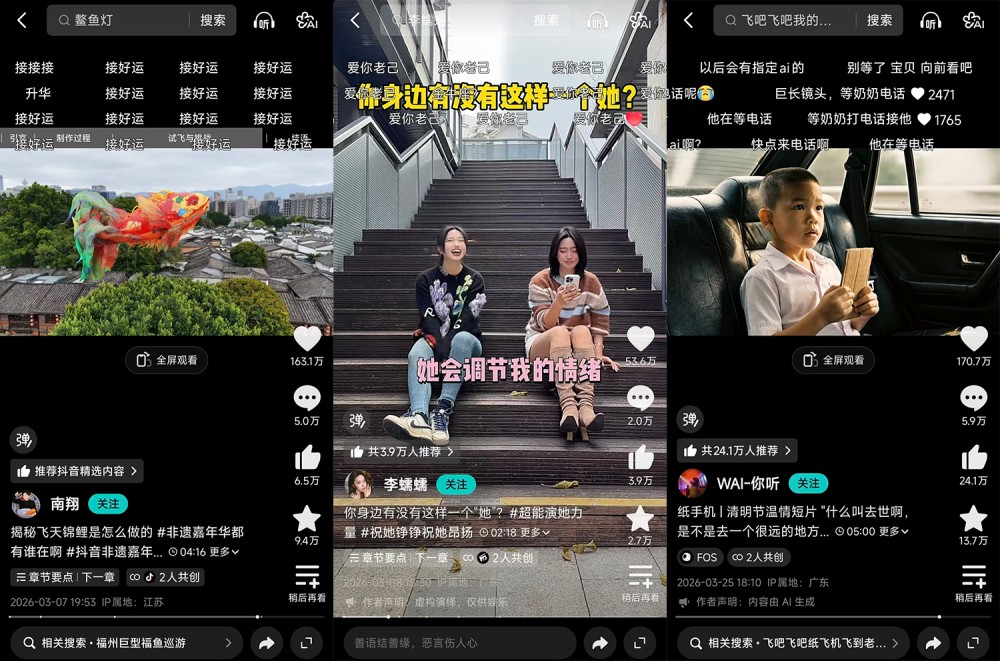 一些“常青树”创作者也在持续产出优质作品。元宵佳节,@南翔 将《山海经》中“文鳐鱼”通过20米巨型空飘技术复活,并与福州地标三坊七巷深度融合,打造出元宵夜晚的福鱼临空、游于古巷之上的奇观,网友赞叹“空飘鱼太美了”“这就是非遗的魅力”。妇女节来临之际,@李蠕蠕 发布视频展现了一个始终陪伴、鼓励、守护自己的好闺密;画面一转,原来那个闺密就是另一个自己,“爱你老己”“身体里住着一个这样的她”等弹幕刷屏。