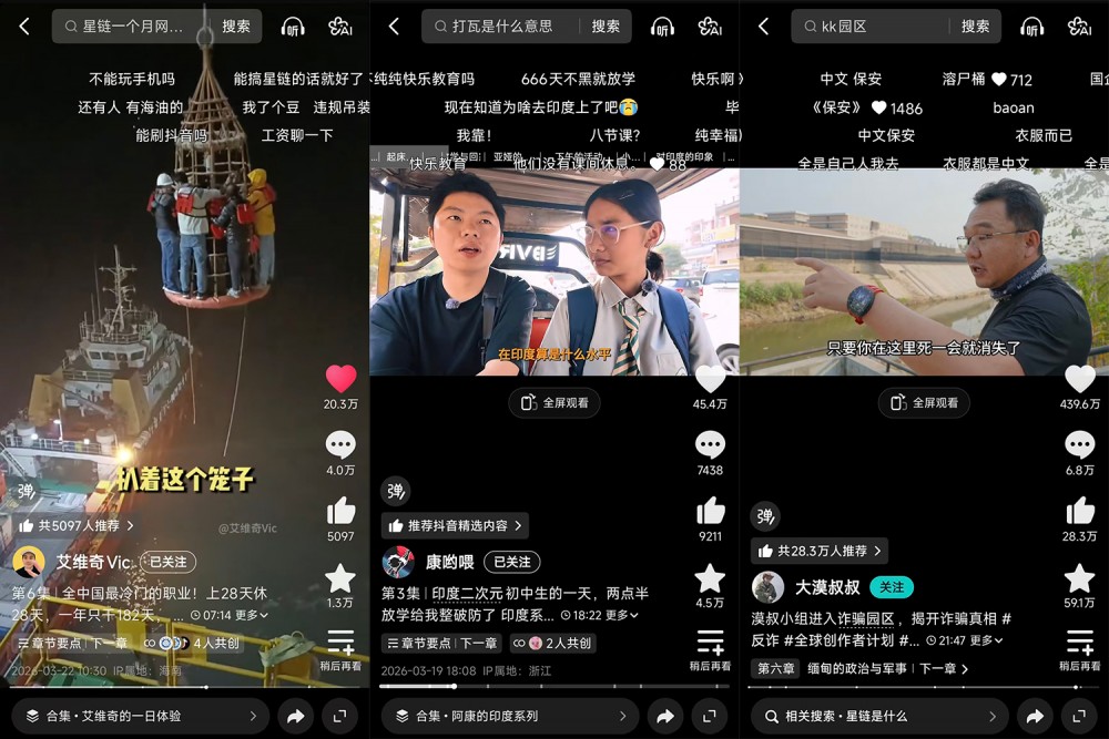 生活记录类内容一直是抖音的一大成熟赛道。网友们跟随创作者的视角,能看到不同职业、不同地域人们的生活方式,也能洞察到复杂的社会现象。创作者@艾维奇Vic 登上了全国唯一有人值守的海上气象站,记录工作人员无聊又令人敬佩的海上生活;@康哟喂 则跟随一位印度初中女生,拍摄其日常生活的一天,带网友了解中印中学生的相同与不同;@大漠叔叔 更是深入缅泰边境拍摄诈骗园区,警示电信诈骗残酷真相。这些纪实性作品表现出具有叙事感的导演思维,体现了抖音创作者的多元与持续成长。