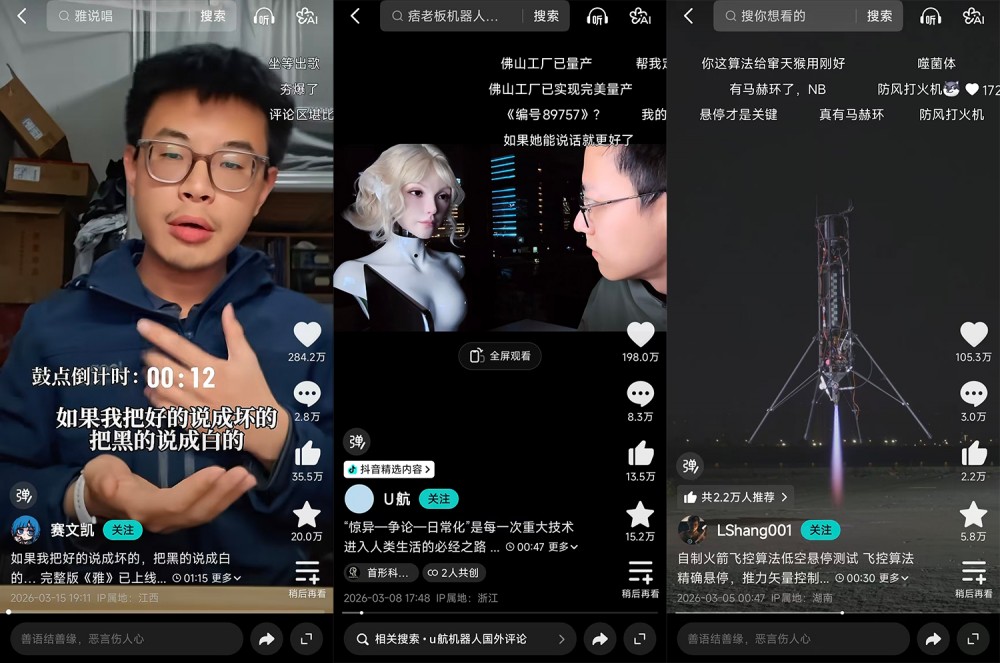 作为青年文化的“显微镜”,榜单真实呈现当代年轻人的表达与追求。Z世代创作者用镜头定义 “好内容”“好生活”,从审美偏好到价值取向,都展现出新一代青年 “有温度、有思考、有文化自信” 的精神风貌。如准博士生、3月精选作者@赛文凯 用说唱剖析社会现象,被网友戏称为“周树人说唱”;@U航 @LShang001 等分别与自制AI机器人对话,手搓可悬停火箭,展现了当代青年的科技素养与创新精神。
