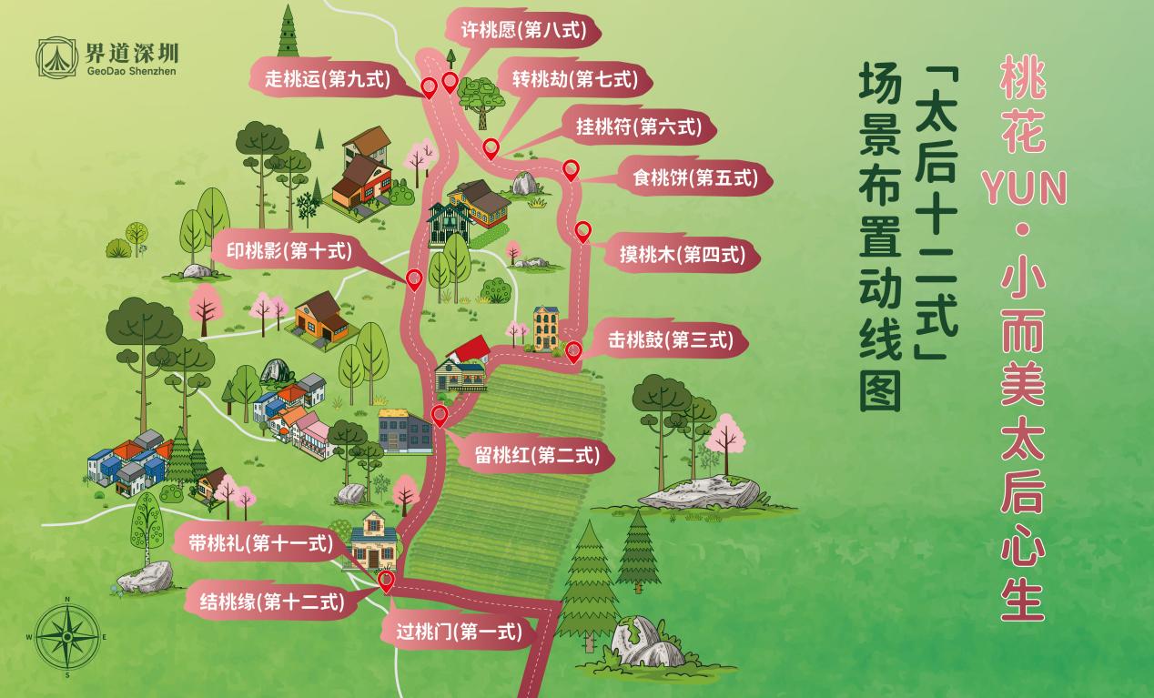 为让这份 “好YUN” 看得见、摸得着、留得下,界道深圳精心策划打造了一套小而美的沉浸式互动体验 ——“太后十二式”。游客手持专属通关文牒,便可沉浸式打卡十二重桃意好运:过桃门、留桃红、击桃鼓、摸桃木、食桃饼、挂桃符、转桃劫、许桃愿、走桃运、戴桃花、带桃礼、结桃缘。每完成一式,即可盖上一枚独具匠心的非遗印章,寓意福运流转、生生不息。集齐十二枚印章,更能直接升级为 “荣誉村民”,解锁限定隐藏福利,把一整年的好运气实实在在带回家。