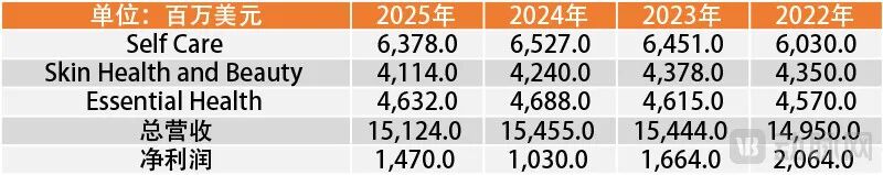 然而,Kenvue上市以来的表现一直很一般,作为独立上市后首个完整财年的2024财年实现年度营收154.55亿美元,较2022财年提升3.3%,但净利润仅有10.3亿美元,较2022财年下降50%之多。2025财年净利润有所回升,但年度营收又下降了2.1%。同时,其三大核心板块业务表现不仅没有提升,反而呈现缓慢下滑的趋势。