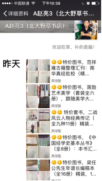 由于处于地下商场的角落,地理位置相对偏僻,加上与隔壁书店存在竞争关系,赵亮在2014年动了用微信进行营销的念头。只要有人来买书,他就强烈推荐对方加自己的微信,而他的微信号也已经从A赵亮1排到了A赵亮4。他每天更新朋友圈,全部都是书籍的照片与简介,既有超低折扣的特价书,也有难买到的绝版书,朋友圈文字格式以两个可爱表情打头,以“XX网卖XX元,我仅售XX元,您需要吗?咱们可以快递到全国各地!”结尾。