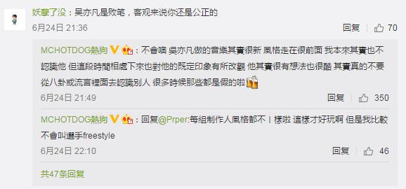 总体来说,《中国有嘻哈》并不差,网友们也不必把注意力都放在吴亦凡身上,毕竟吴亦凡本身的话题度、粉丝数都能提升节目的曝光率,而网友在MC热狗微博下的留言“吴亦凡是败笔”遭到了他的反驳:吴亦凡做的音乐其实很新,风格走在很前面,不要从八卦或流言里面去认识别人。