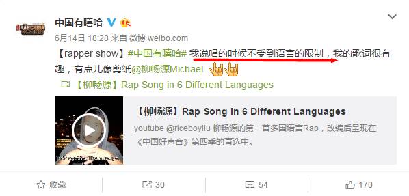 与此同时,《中国有嘻哈》节目组在微博上推出的作品主打“不受语言的限制”,而这确实和张震岳和MC热狗“希望更多中文说唱”的理念相矛盾。