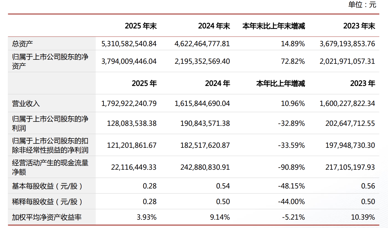 数据显示,公司2025年实现营业总收入17.93亿元,同比增长10.96%;归母净利润1.28亿元,同比下降32.89%;扣非净利润1.21亿元,同比降幅达33.59%。营收规模站上新高,盈利能力却滑落至近年低位。
