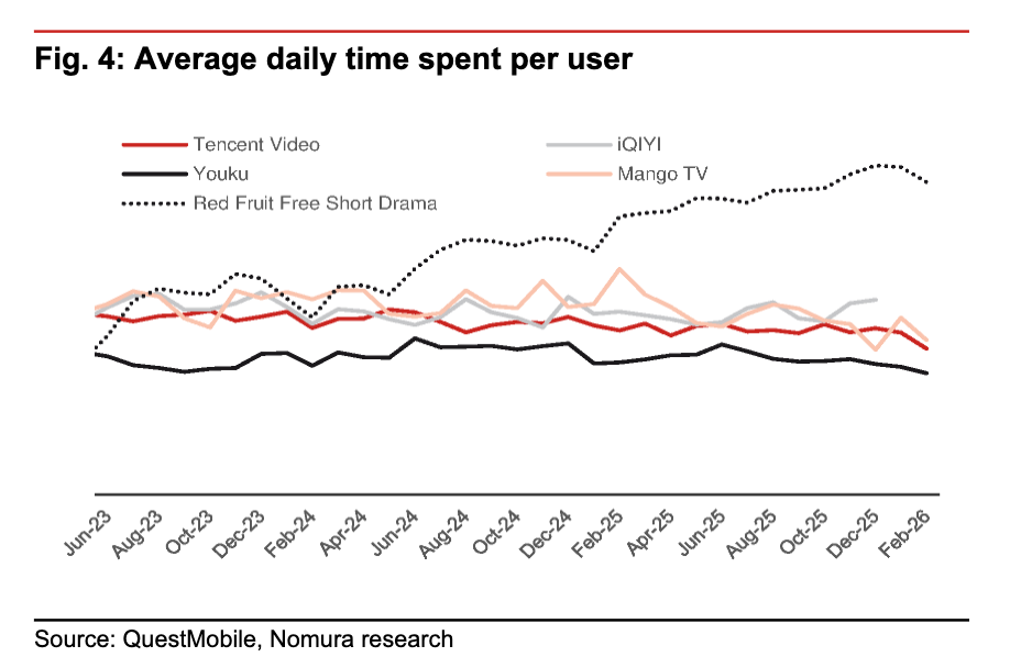 根据野村引用的QM数据,优爱腾芒二月用户使用时长(MTS)同比分别下降了26% 、27%、30%和54%,红果短剧MTS则是暴涨了155%,DAU也录得翻倍。